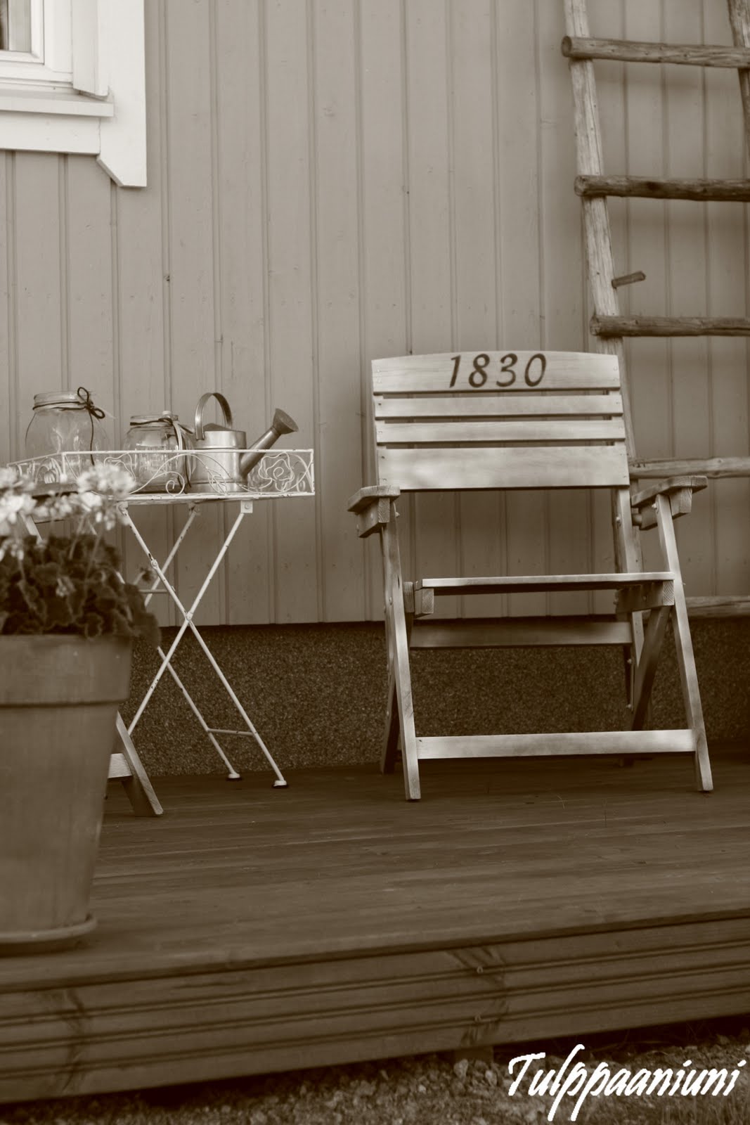 Oooh!! Tuolla terassilla ja noissa puitteissa voisi jopa mullekkin kahvi maistua, vaikka muuten en kahvinkannattaja olekaan!! :) Tuo arkku näyttää ihan niinku ois jostai sisustusliikkeestä ostettu! Ja tuo vuosiluku sopii niinku nenä päähän, myös tuoleihin! :) Nautinnollisia aamukahvihetkiä :)